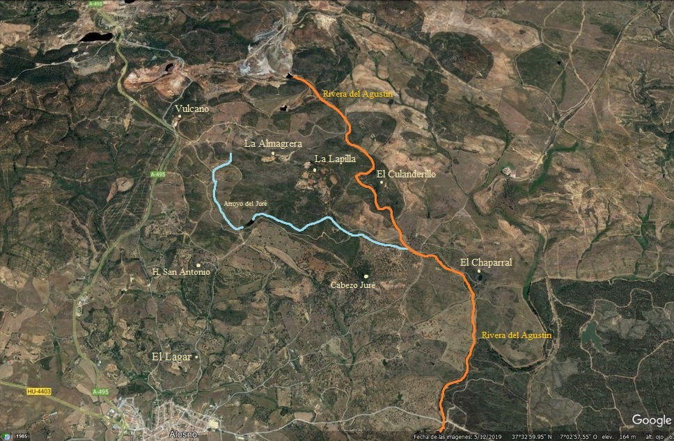 Nueva ruta por la Faja Pirítica de Huelva. En este caso, el sendero recorre cinco minas abandonadas del norte de Alosno, minas que generalmente estaban dedicadas a la extracción de manganeso. Los yacimientos se encuentran localizados muy cerca del núcleo poblacional de Pueblo Nuevo, donde se encuentran las grandes explotaciones abandonadas de pirita. Para quien guste de rutas mineras, esta es la clásica ruta de minas viejas abandonadas y sin habilitar para el tránsito de senderistas. Así las cosas, te encontrarás las cortas sin vallar. Otro de los alicientes de la ruta es caminar junto a la Rivera de Agustín. Lamentablemente, está completamente degradada por los drenajes ácidos de las minas. Durante la segunda parte del recorrido, la presencia del Cabezo Juré es omnipresente. En este cabezo hubo un asentamiento que trabajaba los metales. Tiene unos 2500 años de antigüedad (a.e.c.)